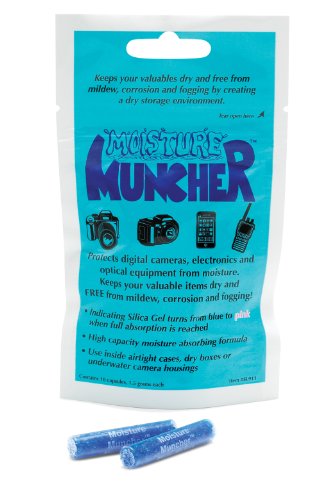 | 6 of 6 people found the following review helpful By Phil (Michigan) - See all my reviews Amazon Verified Purchase This review is from: Sealife Small Moisture muncher 10 capsules, 1.5 grams each (Electronics) Found out that this does work. Not so helpful review, eh? But it works. Tiny enough to fit in my Intova Underwater camera case at the top left :) 5 of 5 people found the following review helpful By This review is from: Sealife Small Moisture muncher 10 capsules, 1.5 grams each (Electronics) I used these in my Canon underwater case with my Canon S90 - there's room in the case for one along the rear right side of the camera, where it won't interfere with any camera functions, and if you're careful, you can fit a second one along the top of the camera (you have to be careful to tilt the case to the side so that the desiccant pack slides to the right before extending the flash, but once the flash is up, you're golden).Never saw the slightest condensation on the inside of the case while using these. Each pack worked for about two or three dives in warm French Polynesian waters before it started to fade from blue towards white (and not, as the instruction said would happen, from blue to pink). These thoughtfully come packaged in a resealable zip-lock-style bag to keep the unused packets safely away from atmospheric moisture until you're ready for them. Highly recommended. 3 of 3 people found the following review helpful Amazon Verified Purchase This review is from: Sealife Small Moisture muncher 10 capsules, 1.5 grams each (Electronics) These work well and are small enough to tuck inside the waterproof camera we use. It comes in a resealable bag to keep them fresh until needed.Their only drawback is that they are single use only. Silica gel can be reused many times by simply warming it up to drive the water out. Why not these? |